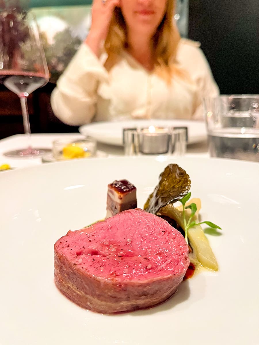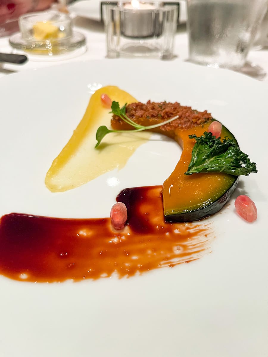 Pour la suite, on a mangé un ceviche de pétoncles d’une fraîcheur inégalée, une entrée de courge kabocha avec une purée de citron et un vinaigre de coing, un risotto à l’encre de seiche, un plat de veau qui était de loin la meilleure pièce de viande que j’ai dégustée à vie et on s’est gâté en ajoutant un service de fromage pour complémenter le tout.