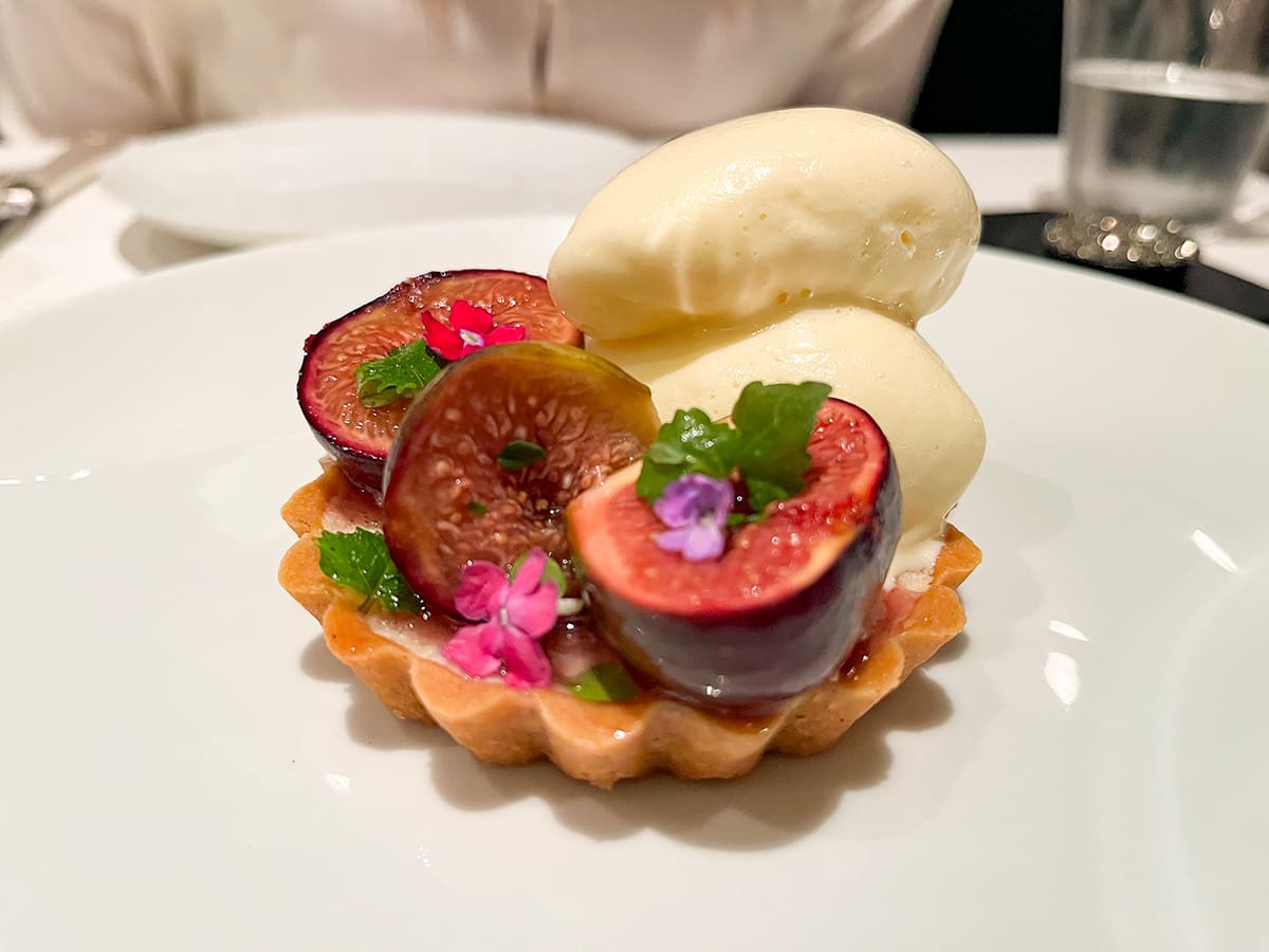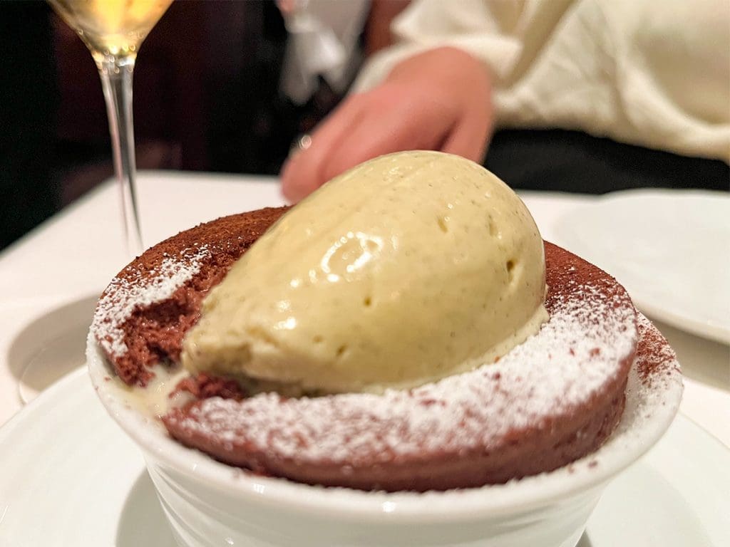 Parlons dessert ! Habituellement, ma copine et moi sautons le service du dessert car on n’a pas la dent sucré. Mais, 3 desserts étaient inclus dans notre formule 5 services et on est vraiment content de s’être indulgé. Le premier service de dessert était un sorbet à l’orange sanguine servi avec une mousse au Champagne, question de nous ouvrir le palet. Mais, on était juste pas prêt pour la suite. Une tartelette à la crème d’amande, figues caramélisées au miel servi avec une glace à l’amandon de prunier (fait à partir des noyaux de prunes séchées). Le mélange de saveurs était délicat et parfait, mais comme on garde le meilleur pour la fin, laissez-moi vous parler du soufflé au chocolat. C’était de loin le meilleur dessert que j’ai goûté de ma vie. Fait avec du chocolat d’une qualité exceptionnelle, accompagné d’une quenelle de crème glacée maison, c’était la façon parfaite de terminer cette soirée mémorable.