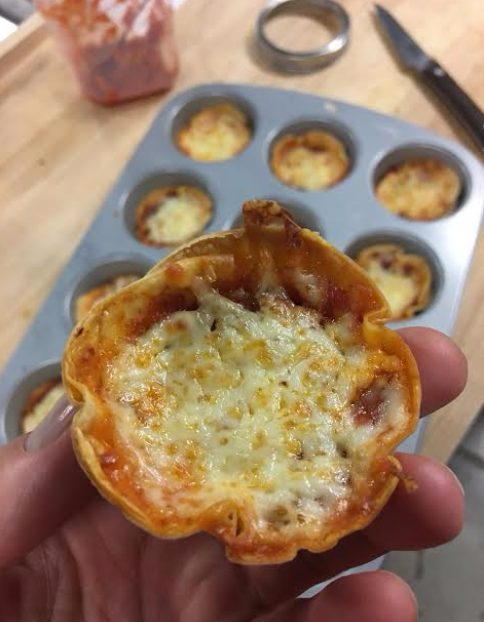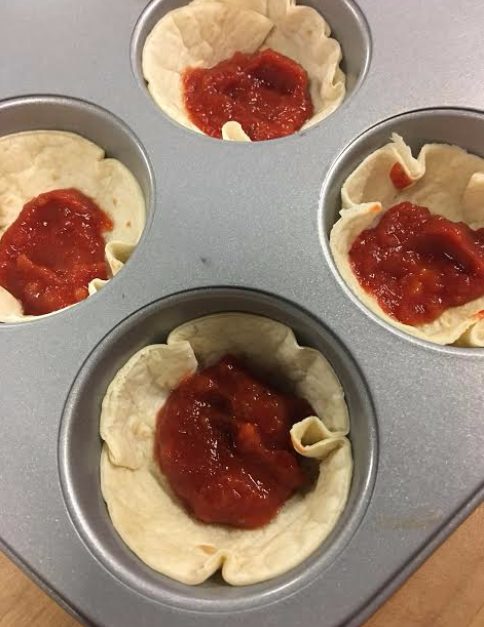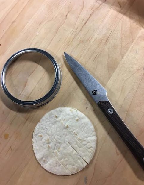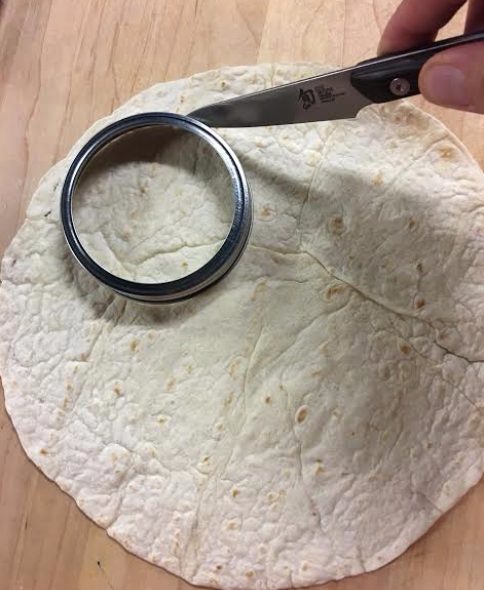 Tailler des cercles de tortillas d’environ 8 cm de diamètre (cuire les retailles en même temps que les minis pizzas et s’en servir en guise de croustilles)